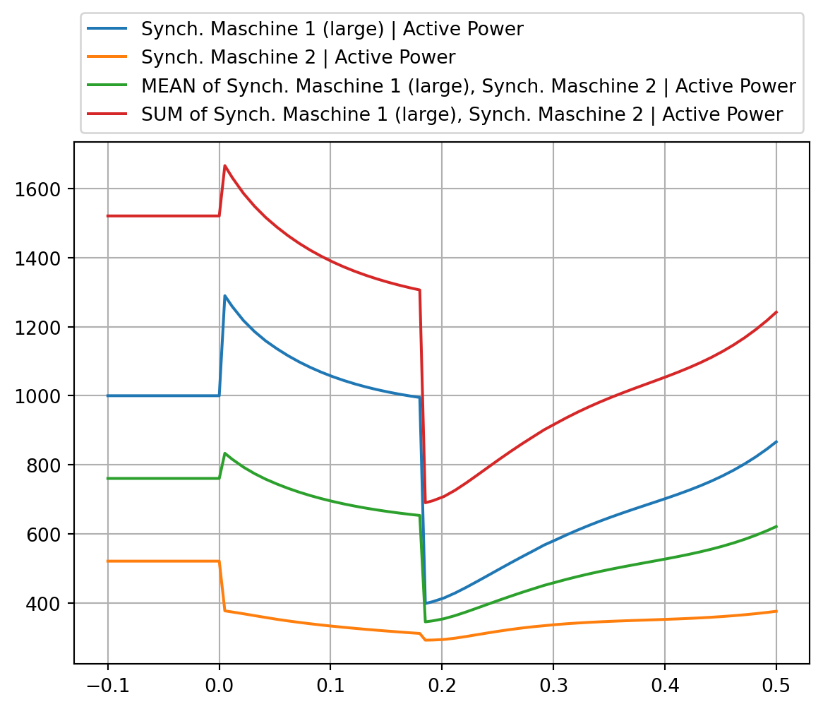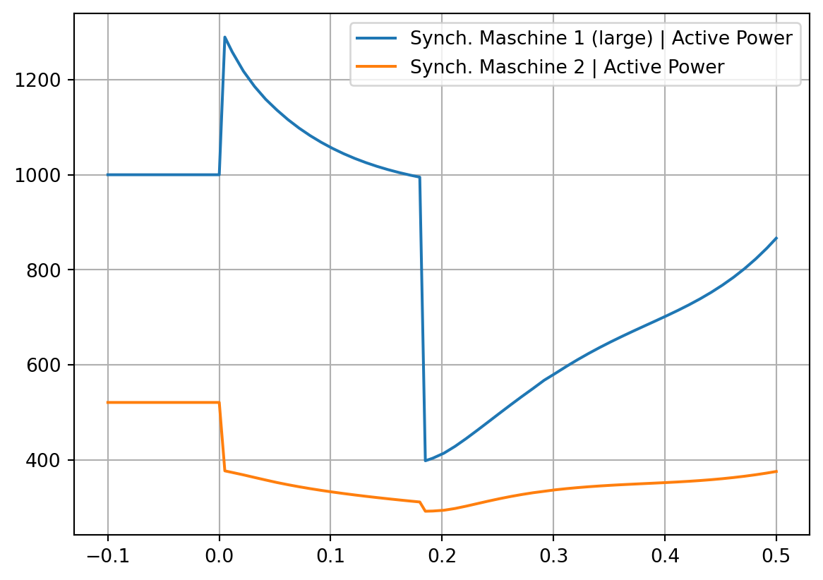 pfplt.plot_monitored_variables(g_01, RMS_bal.ElmSym.s_P1.value)Sometimes we have created plots in one study case and want to have those plots also in another study case. This can be achieved by copying the graphics board content (or parts of it) from one study case to another: