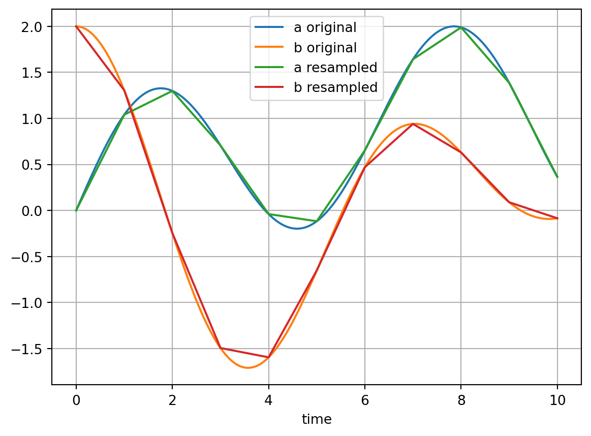 import syssys.path.append(r"..\..\src") # local path to trimes (usually not required)import trimesimport numpy as npimport pandas as pdfrom matplotlib import pyplot as pltaverage_sample_time =1e-3time = np.arange(0, 10, average_sample_time)time = time + (np.random.rand(len(time)) -0.5) *1e-5# Make sure that the first time step is zero and the last equals to 10. This is not a generic requirement of trimes, but necessary for this tutorial.time[0] =0time[-1] =10val_a = np.sin(time) + np.sin(time *0.2)val_b = np.cos(time) + np.cos(time *0.7)plt.plot(time, val_a, label="a")plt.plot(time, val_b, label="b")plt.legend(loc="upper center")plt.grid()print("Time samples:")print(time)