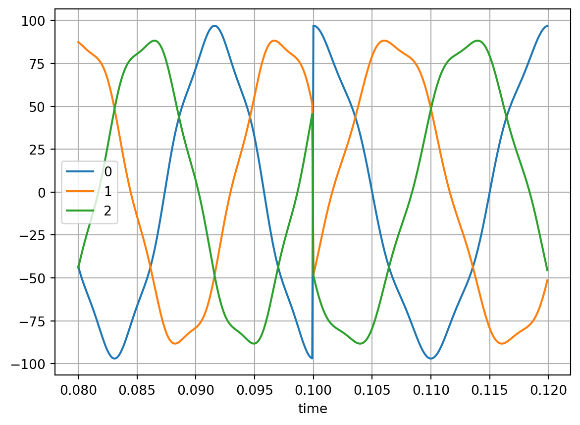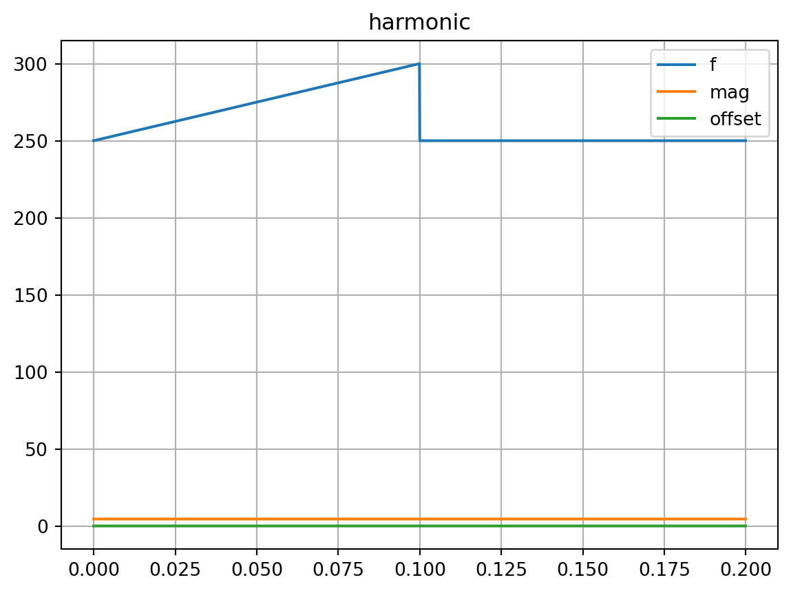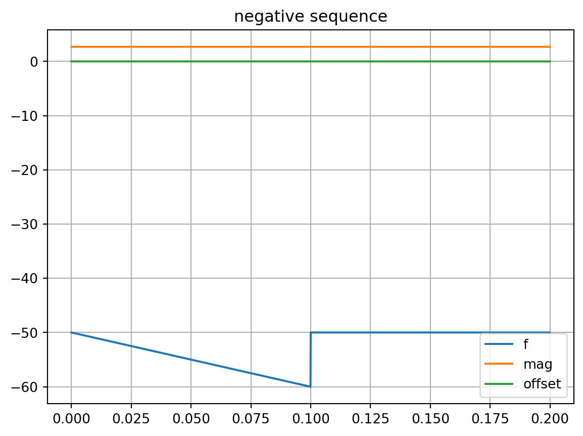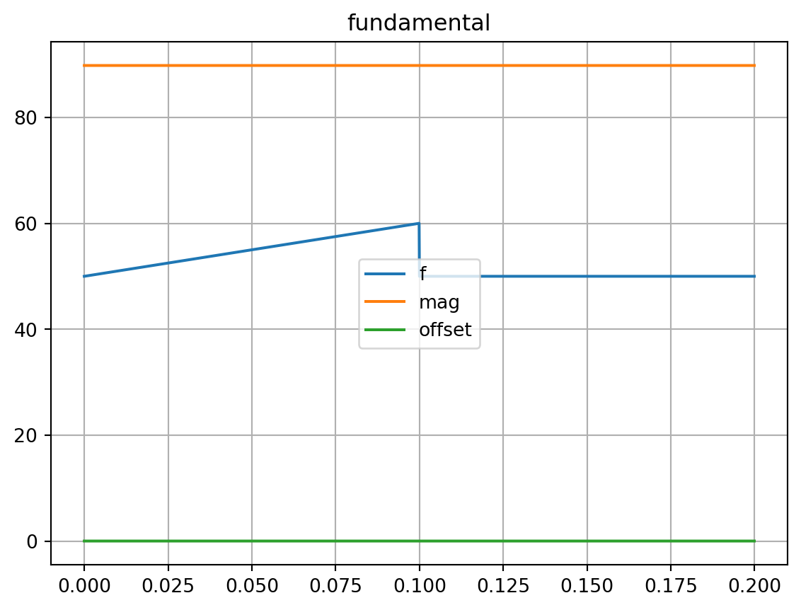 Signals can be superimposed and concatenated by creating an array of signals. The rows of the array are superimposed and the resulting column is concatenated. The following signal is created: - two time periods (with varying frequencies) - 0-0.1 s - 0.1-0.2 s - several frequencies are superimposed: - fundamental: \(50\) Hz (actually varies between \(50\) and \(60\) Hz) - fifth harmonic: \(5*50=250\) Hz - negative sequence: rotating with \(-50\) Hz (actually varies between \(-50\) and \(-60\) Hz) - \(3\) phases