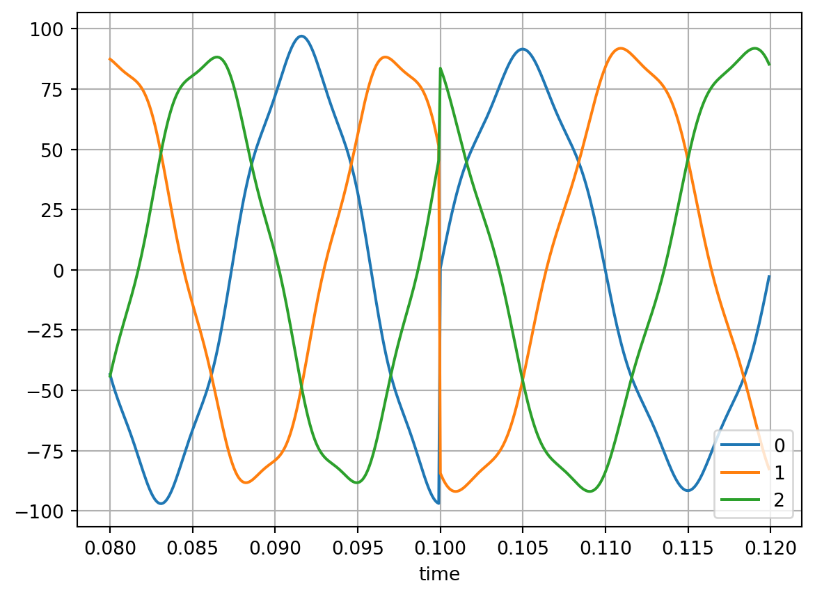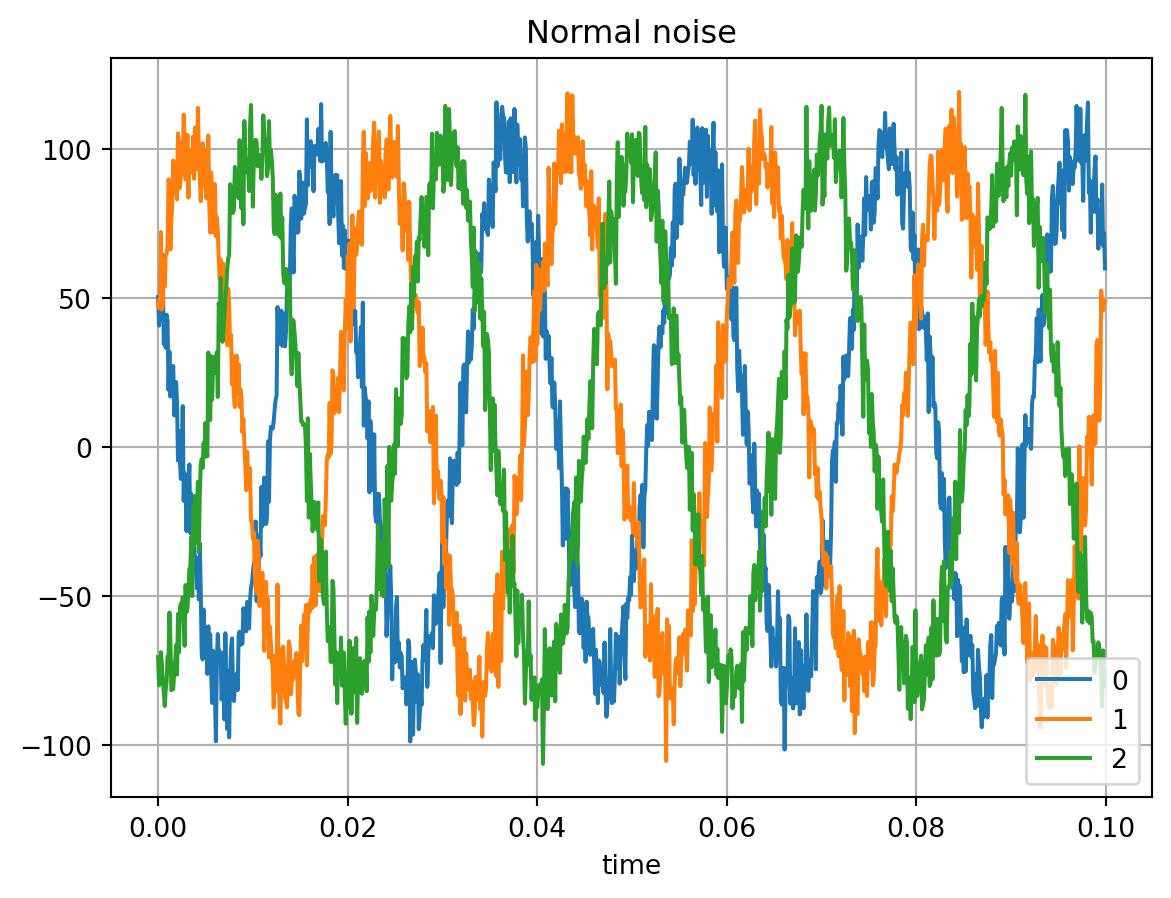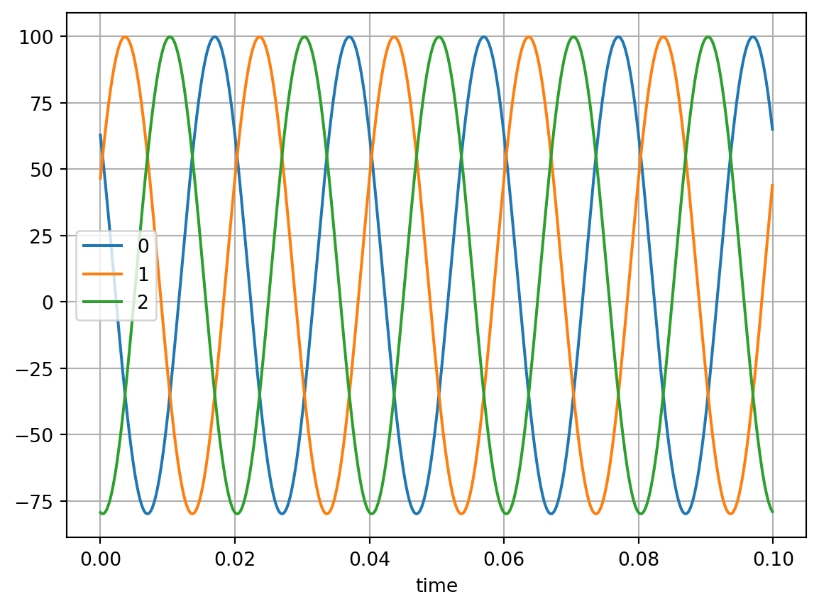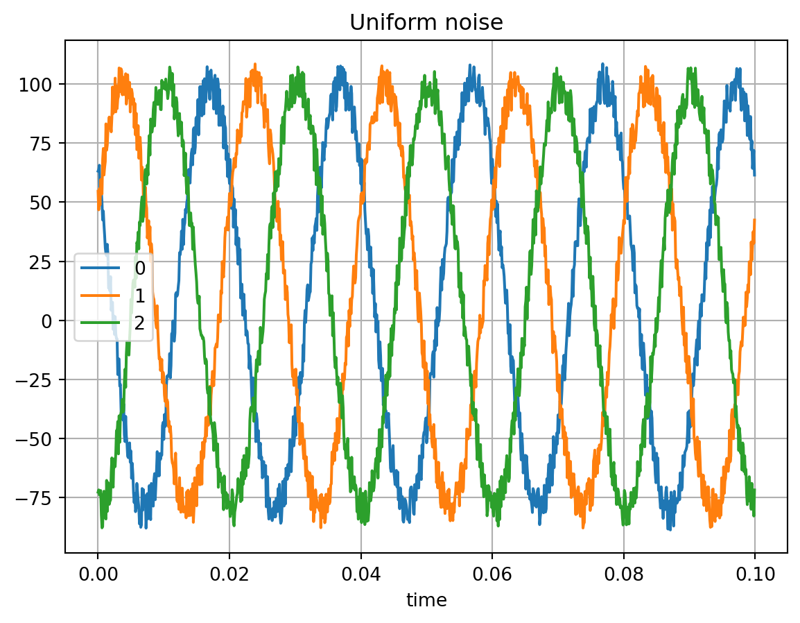 To illustrate the addition of noise to signals, we first create a “clean” periodic three-phase signal.