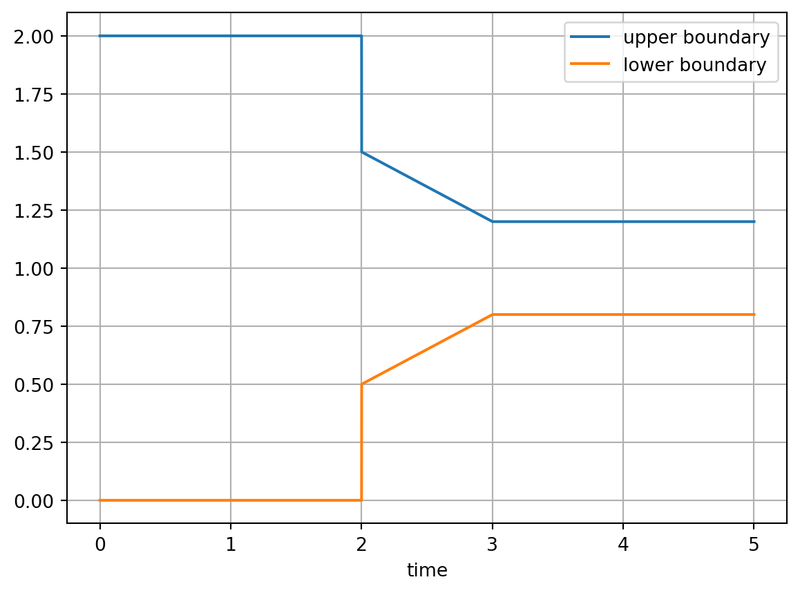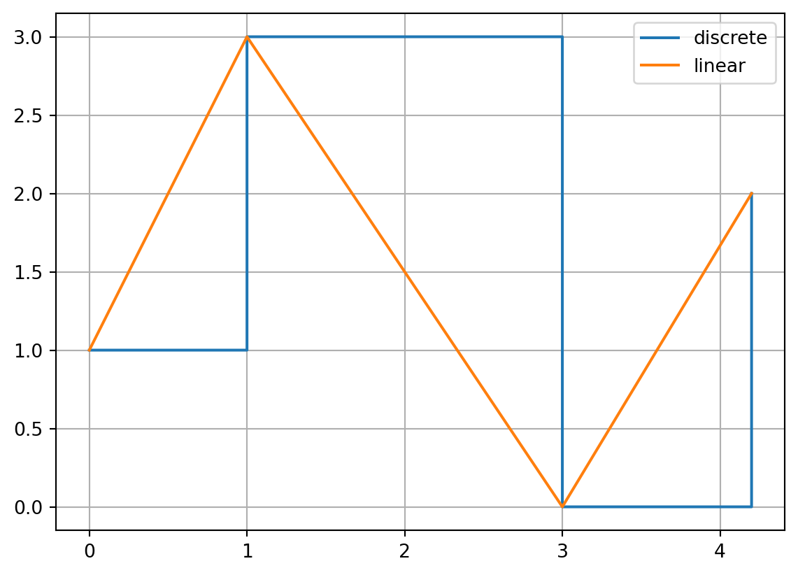 In the above examples, we created discrete steps from one time step to the other (discontinuity) by setting two consecutive time steps with the same value (e.g. t = (0, 2, 2, 3, 5)). If you want to create a signal solely containing discrete steps and don’t want to type the values of each step twice, there is a convenience function which accepts a Timeseries as input: